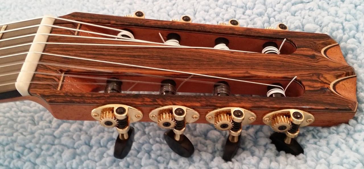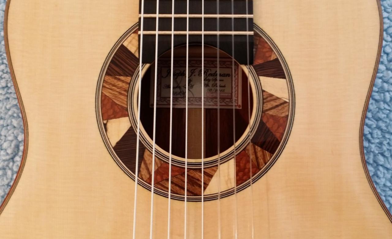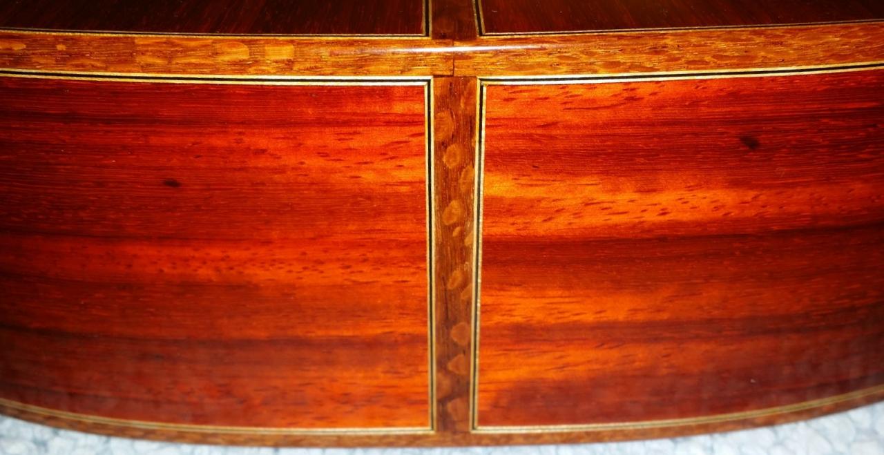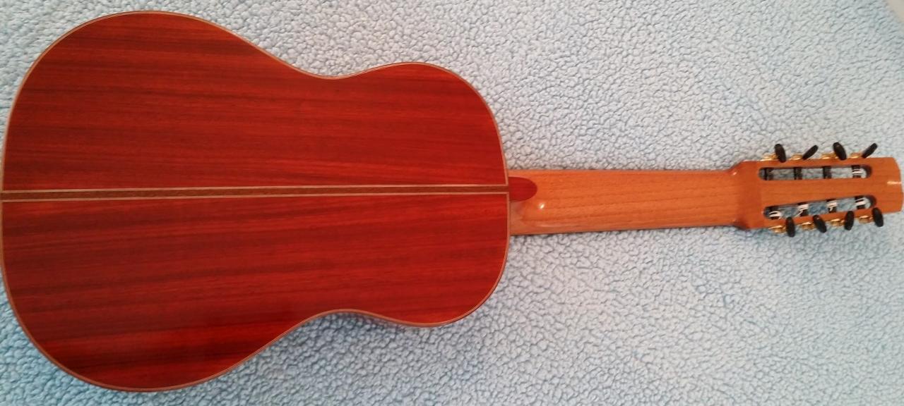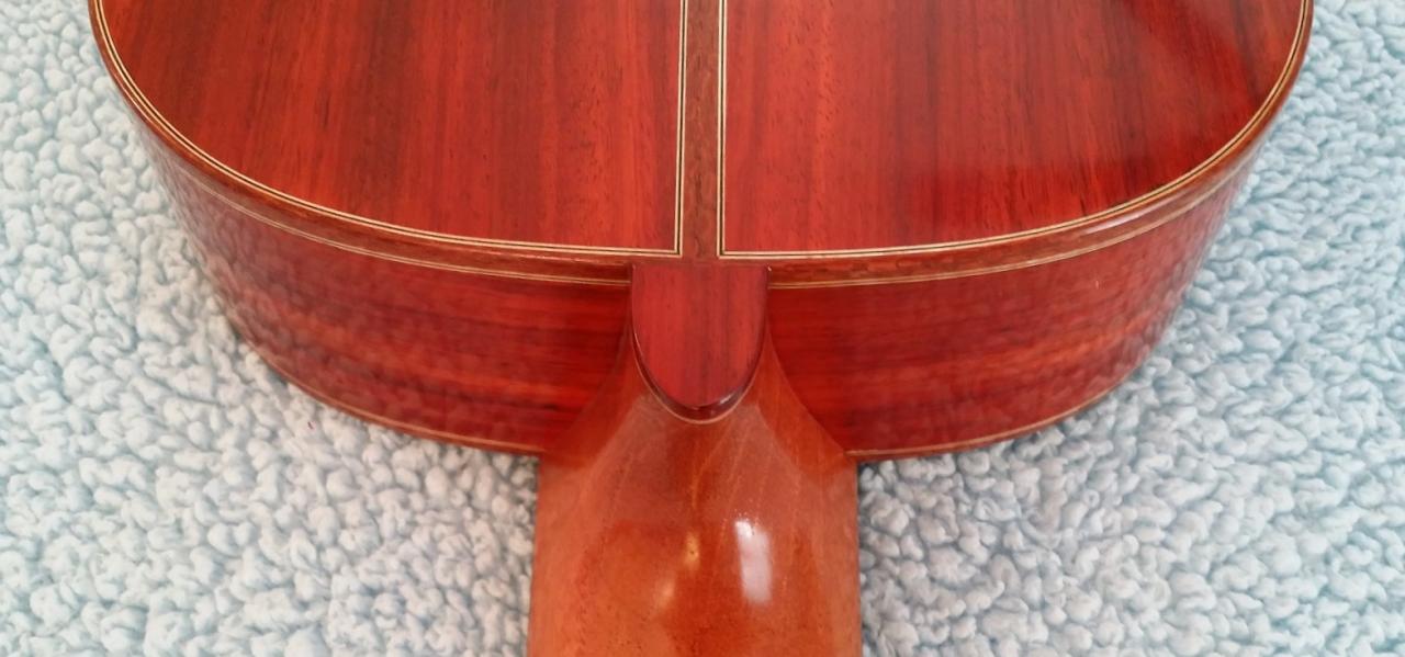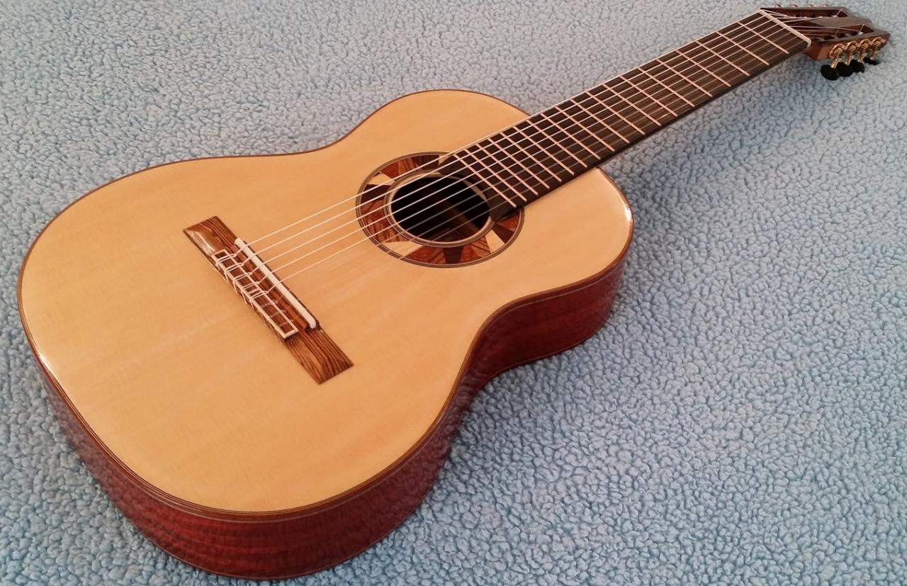 I recently completed this 8-string guitar. It is in Padauk and Lutz spruce, with a 625mm scale length. The rosette is in a variety of Wenge, Zebrawood, Maple and Leopard wood.